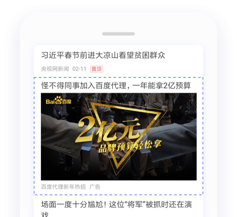 信息流广告是在百度APP、百度首页、贴吧、百度手机浏览器等平台的资讯流中穿插展现的原生广告,广告即是内容。